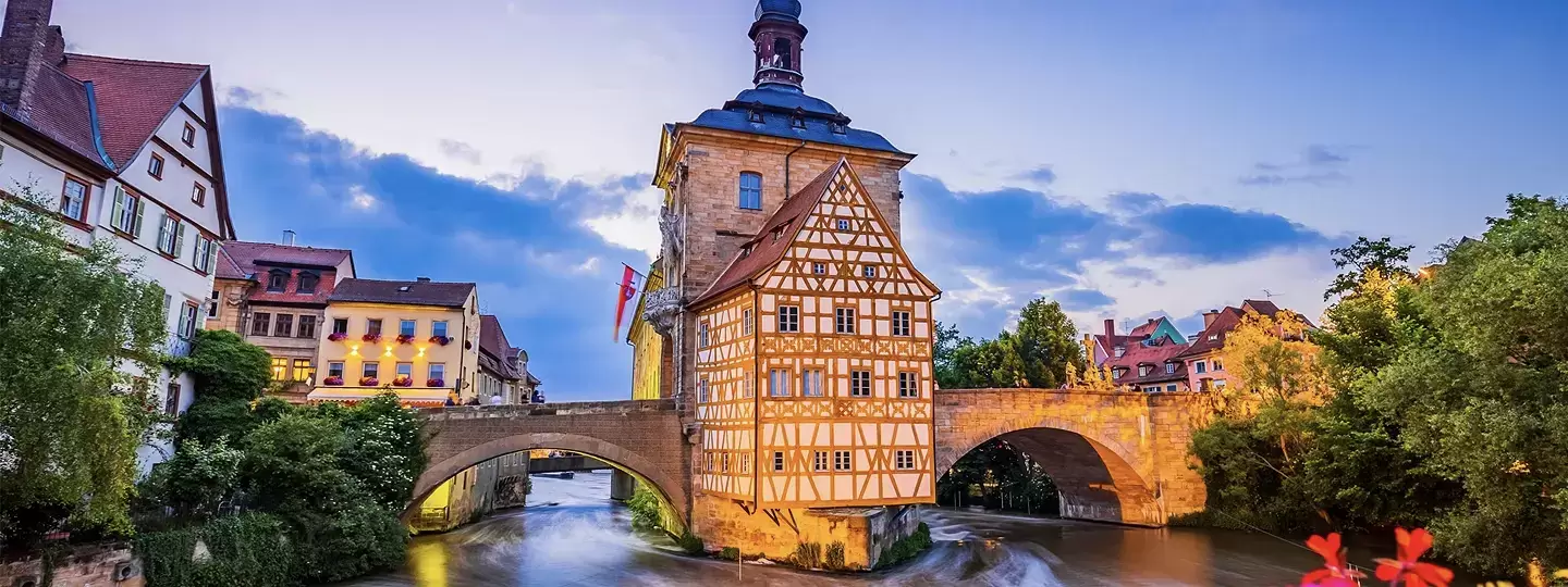 Bamberg, uma joia da Baviera conhecida por seu charme medieval e cenário pitoresco à beira do rio Regnitz. A cidade é famosa por seu centro histórico, listado como Patrimônio Mundial da UNESCO, com casas medievais e barrocas bem preservadas, a impressionante Catedral de Bamberg e a antiga prefeitura construída sobre o rio.