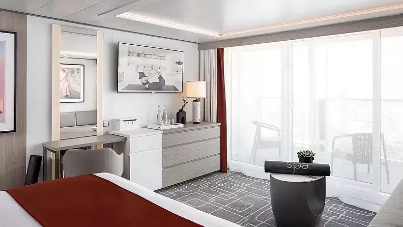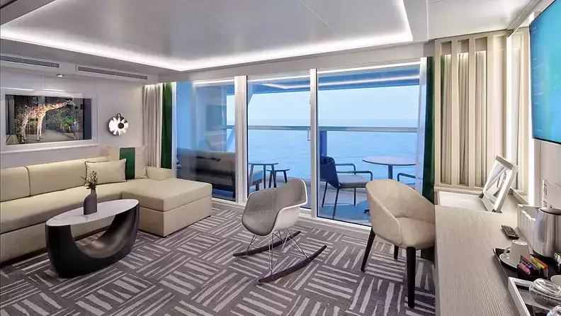 Relaxe em uma sala de estar e jantar luxuosamente ampla com janelas panorâmicas do chão ao teto, um quarto principal com roupa de cama eXhale® da Celebrity e o luxuoso colchão king-size Cashmere™, um banheiro principal com uma grande banheira de imersão, chuveiro separado e pia dupla, além de uma espaçosa varanda privativa. Não importa onde você esteja nesta suíte, você desfrutará de vistas deslumbrantes do mar. -